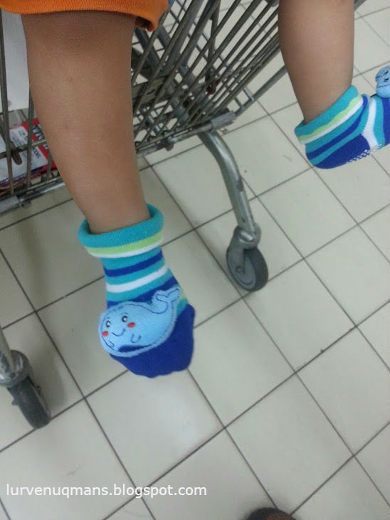 tapi sedey.. rupanya stokin ni ada loceng. mujur bunyi tak kuat, masa beli tu esaited sangat suruh Fatih terus pakai. then pi bayar. takdela terfikir beli stokin kena goncang ke ape kan memandangkan pelik la pulak tetiba ko beli stokin tapi goncang kat tepi telinga. hahahahaha loceng tu pulak kemain tak bunyi langsung waktu tu. aku siap beli 2 pasang. 1 lagi gambar Star.